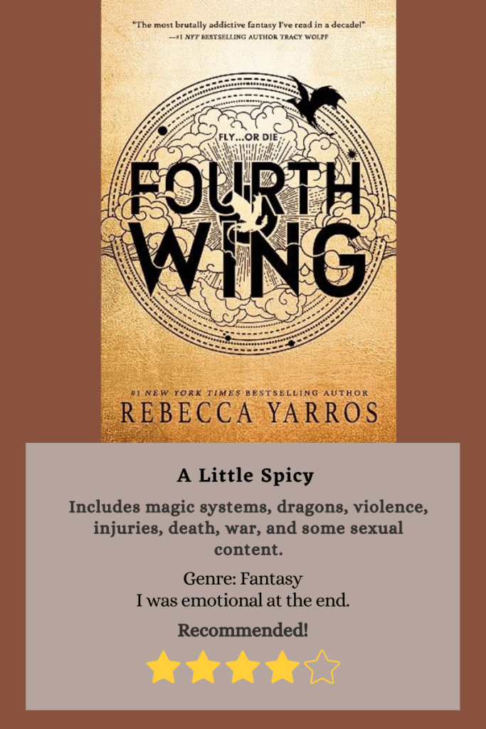 This is the first book in a romance fantasy series. It’s told in the first person perspective mostly by Violet. The story follows Violet’s journey to graduation, struggling to learn, train, and not die by other cadets or dragons who flesh out those they consider weak.
