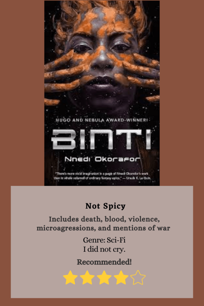 I came into the book, not sure what to expect. It opens with Binti running away and kept my interest from there, getting straight to the point about her experience. It’s a quick read; it only took me about an hour or so to get through it.