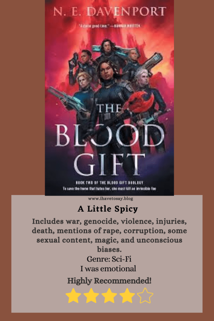 This is the second book in The Blood Gift Duology. You can find my first book review here. This book is a sci fi book with a bit of romance, full of action. Like the first, it read like a movie. It’s November 2023, and I’ve read about thirty books this year. So far this series remains as my number one series of the year.