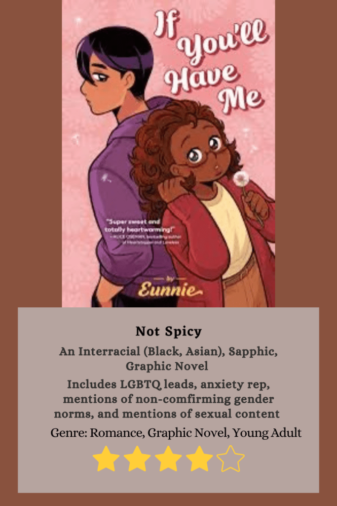 Overall, I give this a 4 out of 5 stars. It was super cute, made me laugh unexpectedly, and I enjoyed their banter. The moments they were there for each other were lovable and it’s a great graphic novel if you’re looking for a fluffy romance in a college setting, with diverse characters.