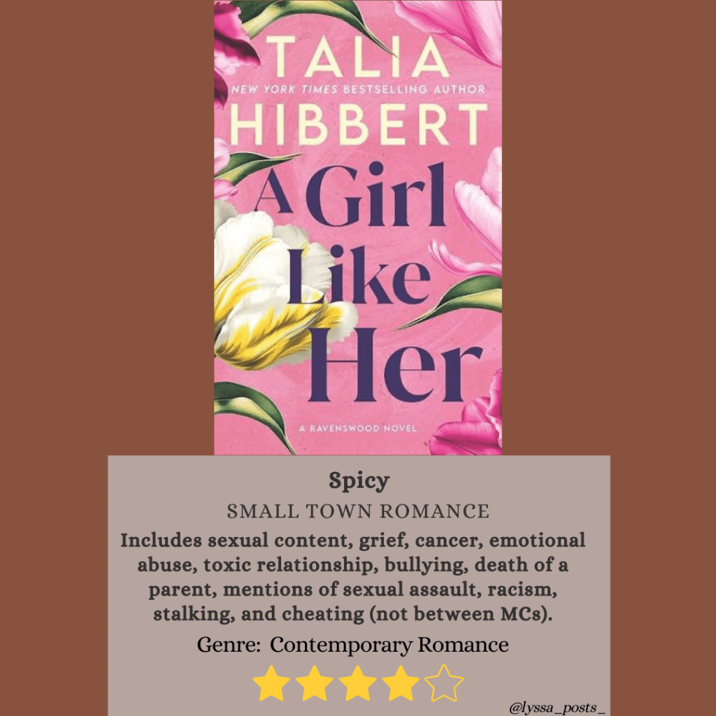 Overall, I give this a 4.25 out of 5 stars. This is a light hearted, fast paced read and as always, I love Talia Hibbert’s writing.